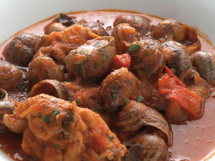 Pica los pimientos y agrégalos. Añade también la salsa de tomate y los caracoles. Cocina todo junto a fuego lento durante 5 minutos. Sirve y espolvorea con un poco de perejil picado.